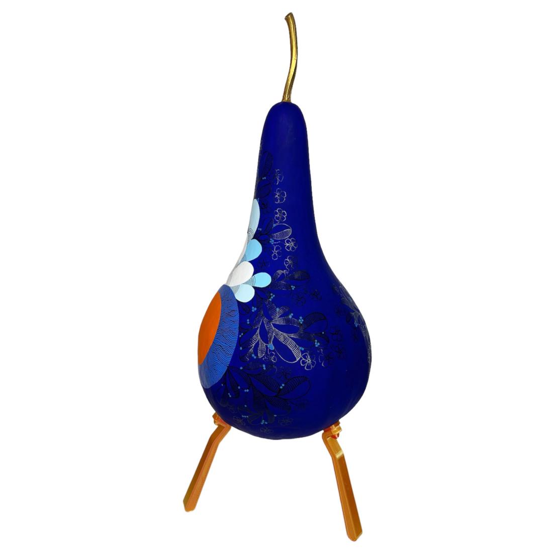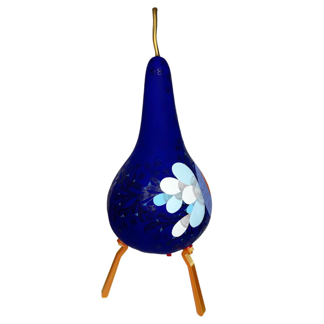 Coloquinte peinte (gourde lagénaria sèche). 3 pieds imprimés en bio-plastique (amidon de maïs). Hauteur totale 50 cm. Pièce unique.