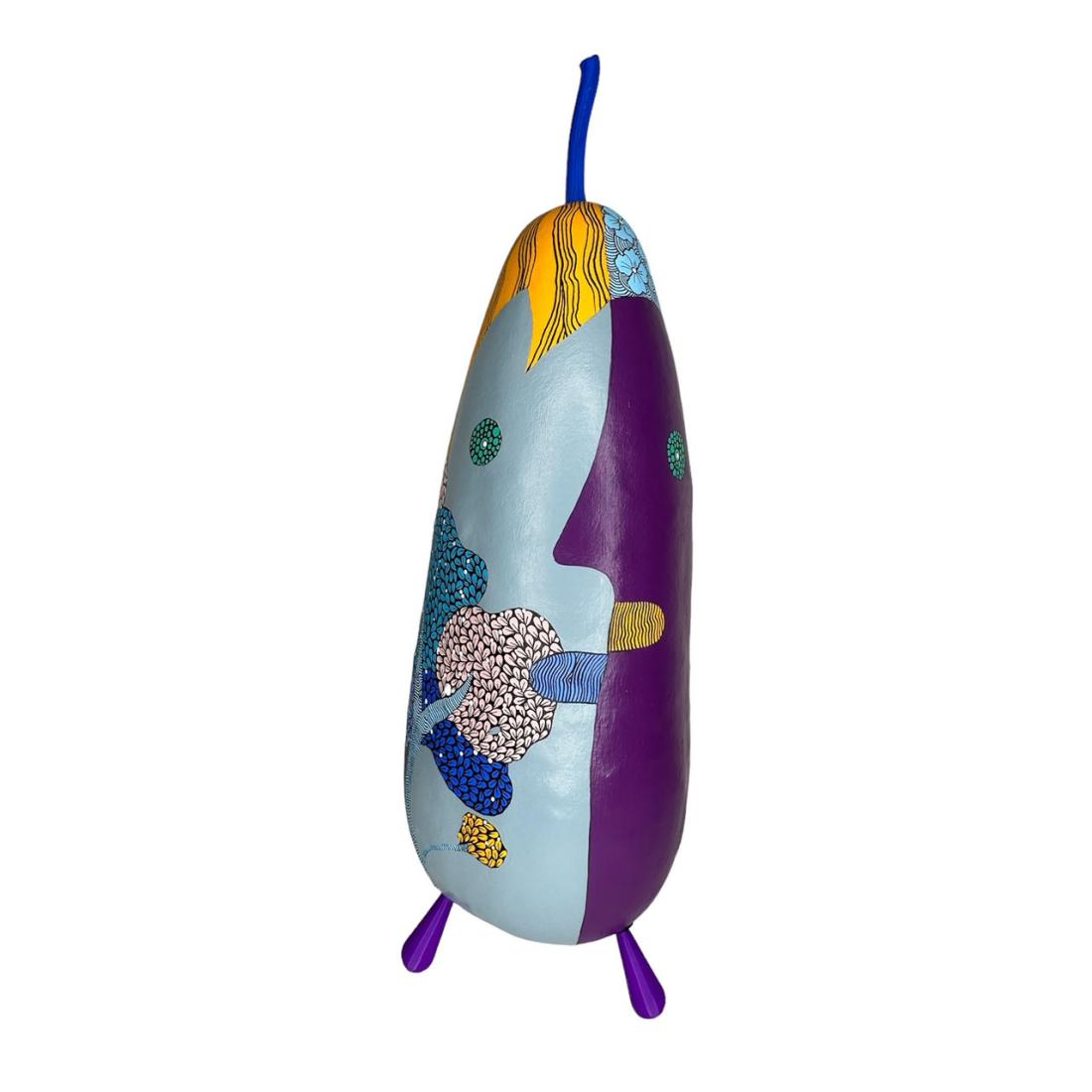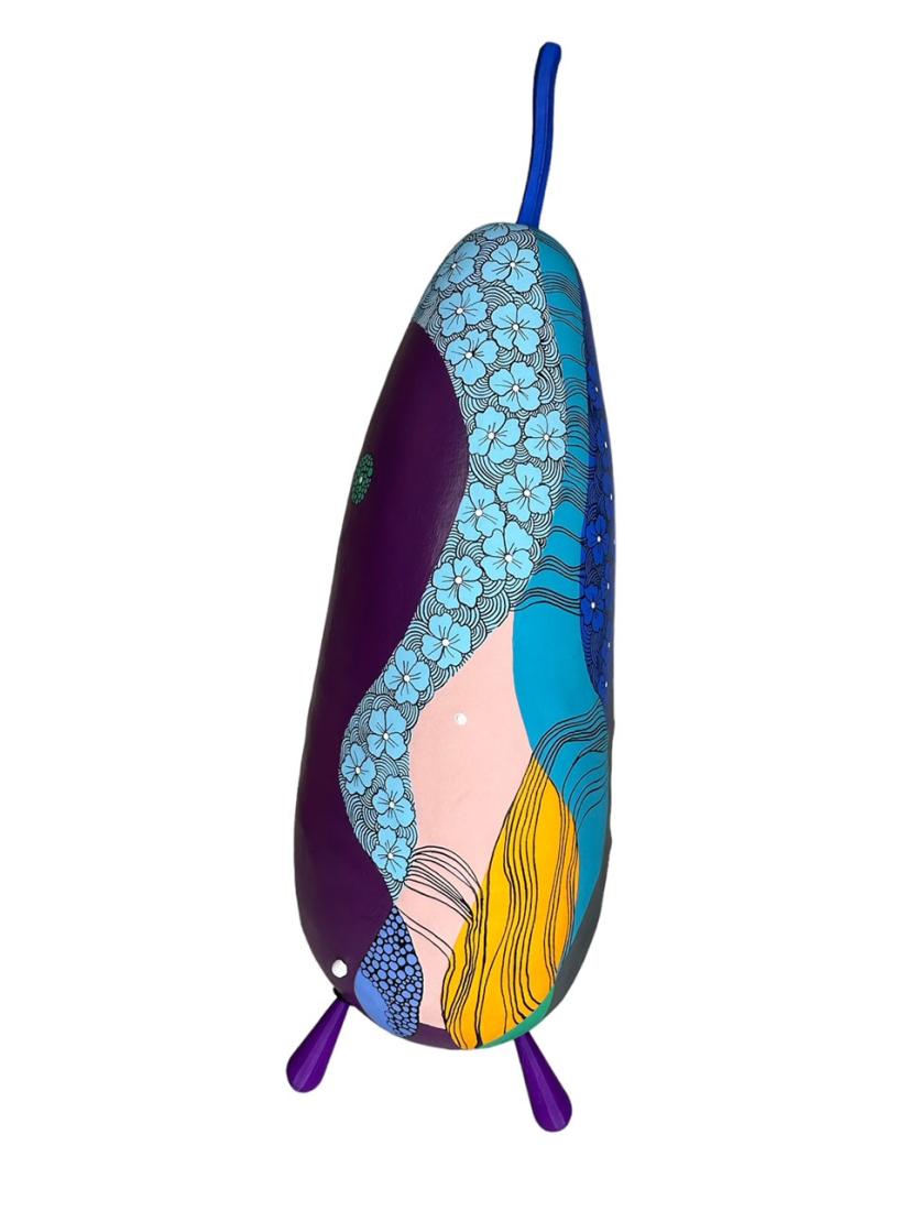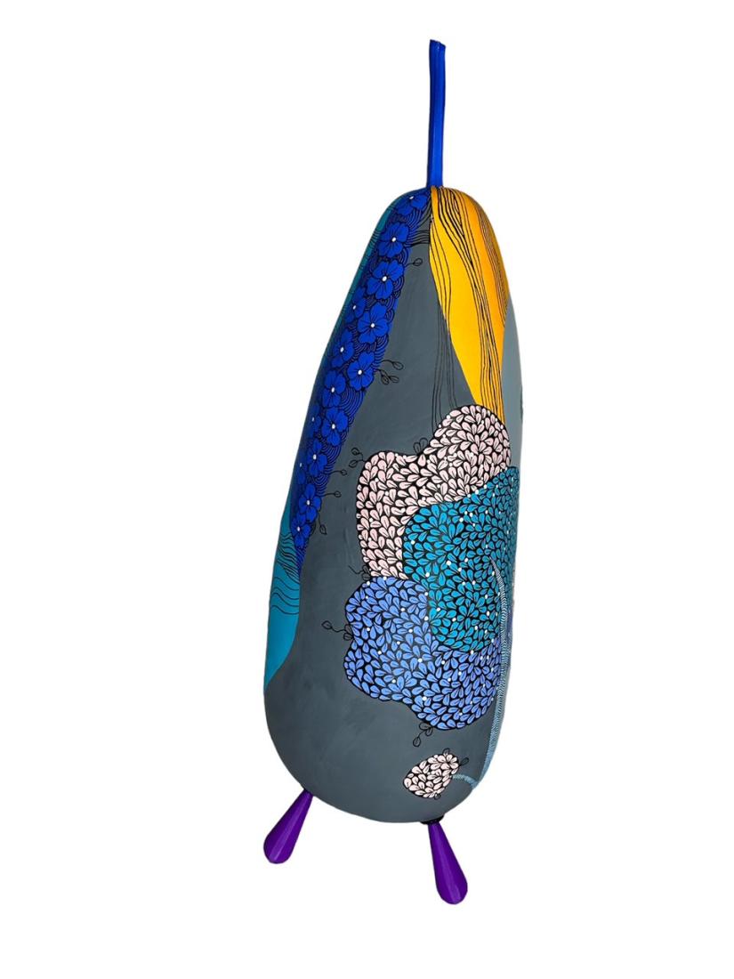 Coloquinte peinte (gourde lagénaria sèche). 3 pieds imprimés en bio-plastique (amidon de maïs). Hauteur totale 48 cm. Pièce unique.