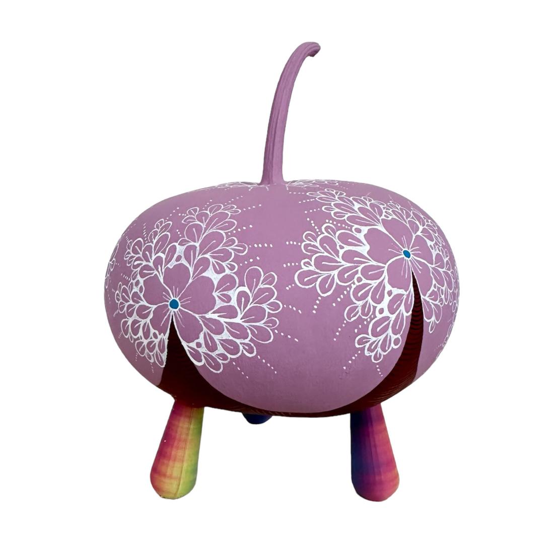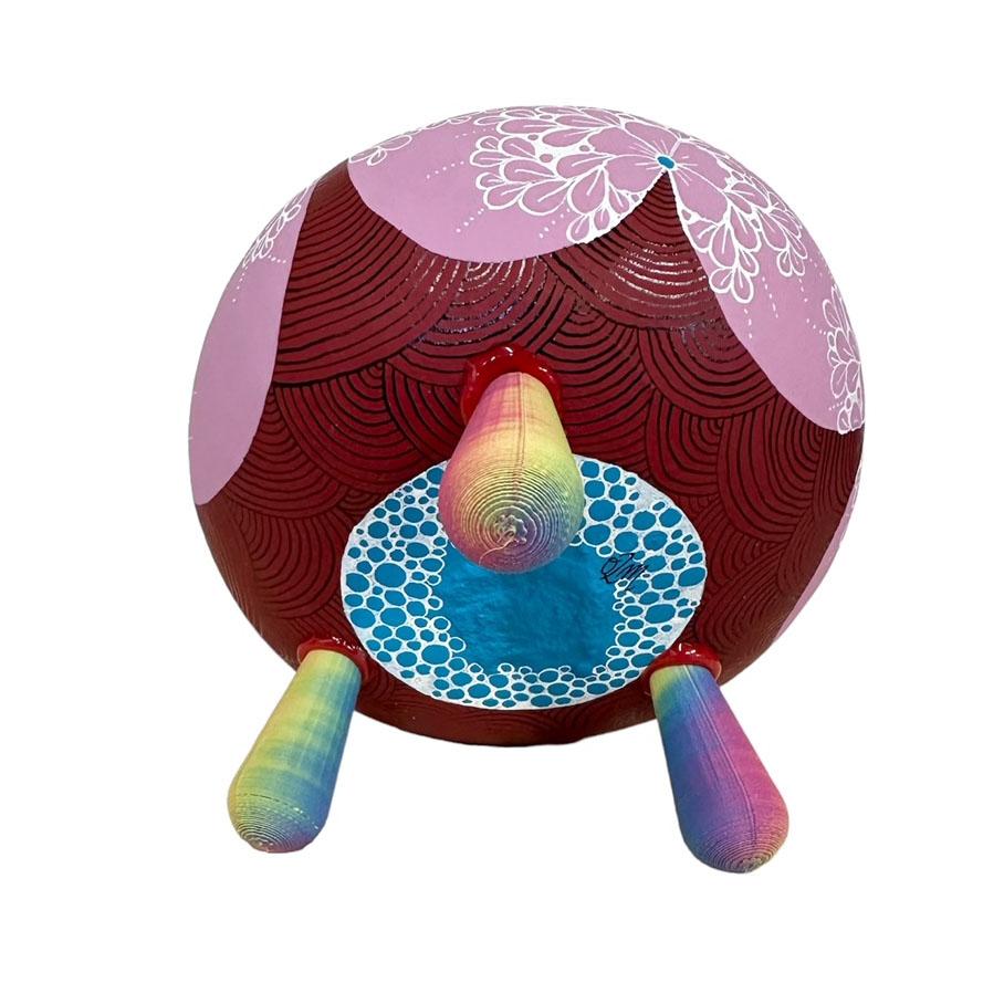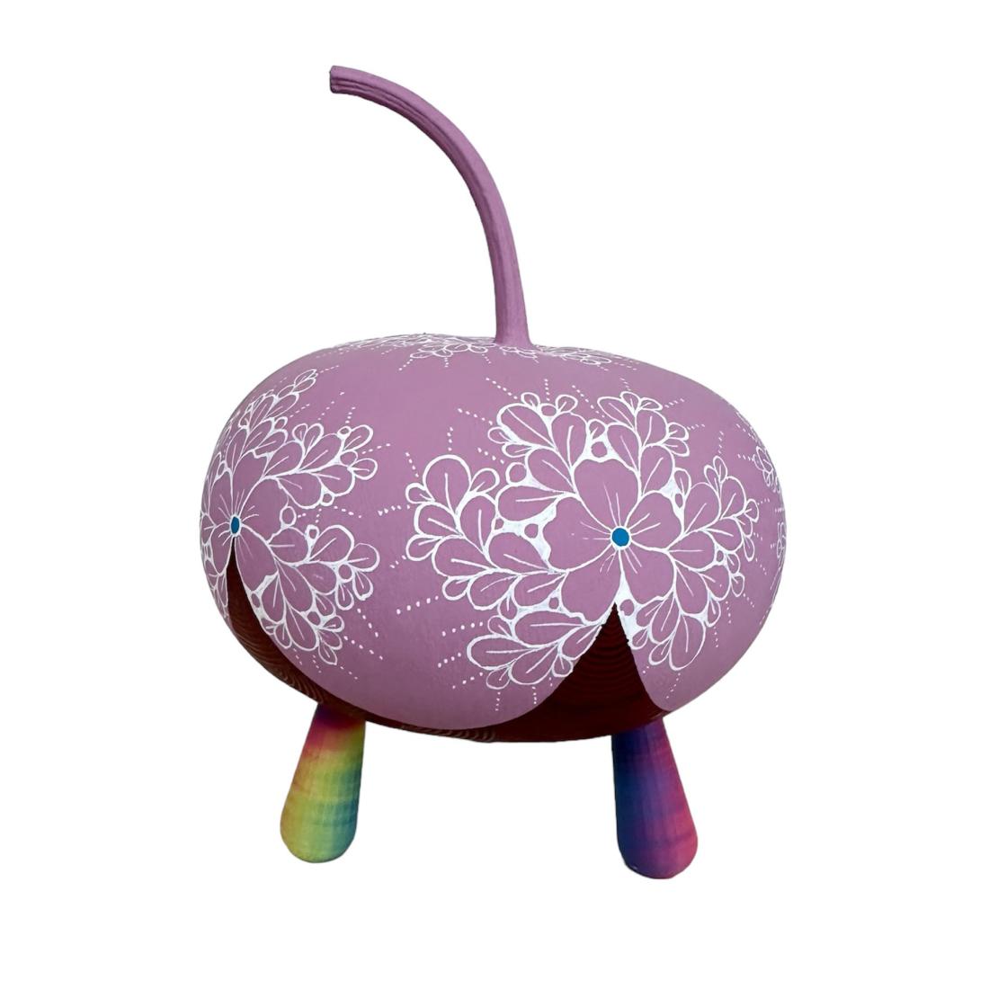 Coloquinte peinte (gourde lagénaria sèche). 3 pieds imprimés en bio-plastique (amidon de maïs). Hauteur totale 22 cm. Pièce unique.
