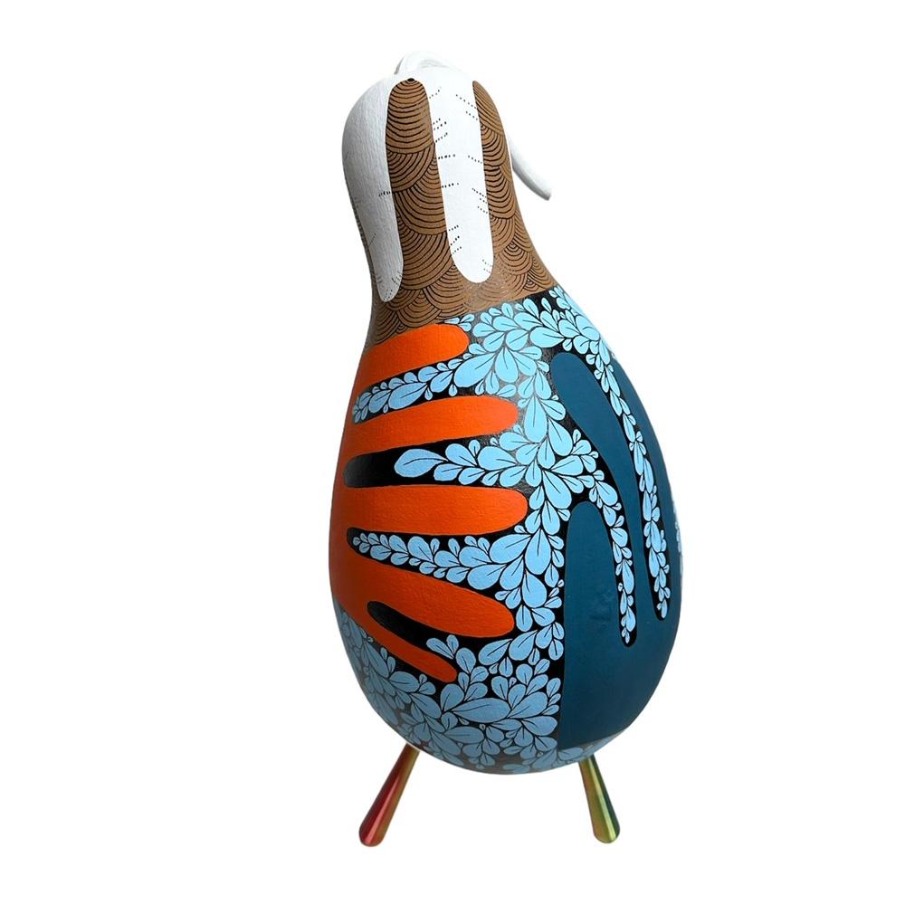 Coloquinte peinte (gourde lagénaria sèche). 3 pieds imprimés en bio-plastique (amidon de maïs). Hauteur totale 32 cm. Pièce unique
