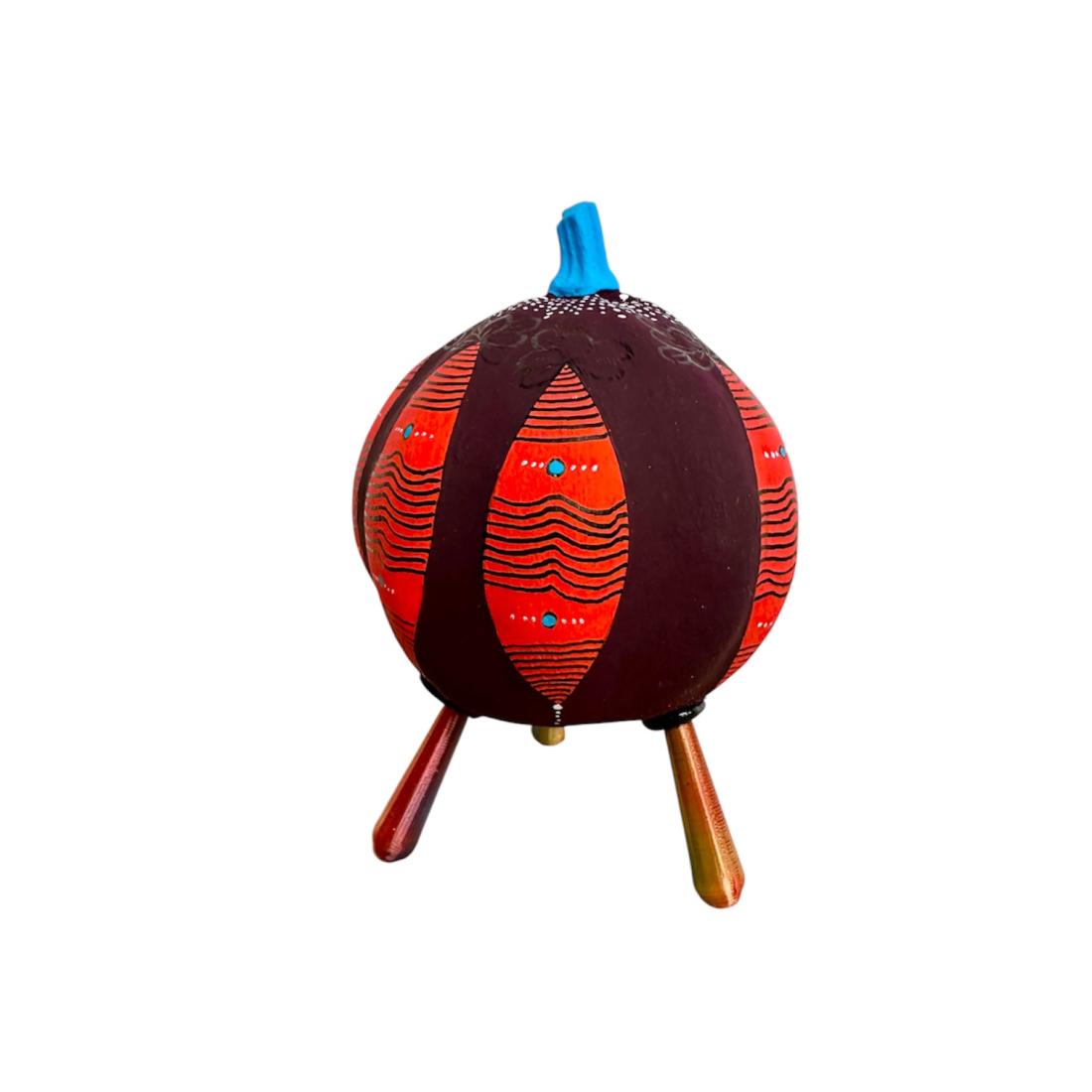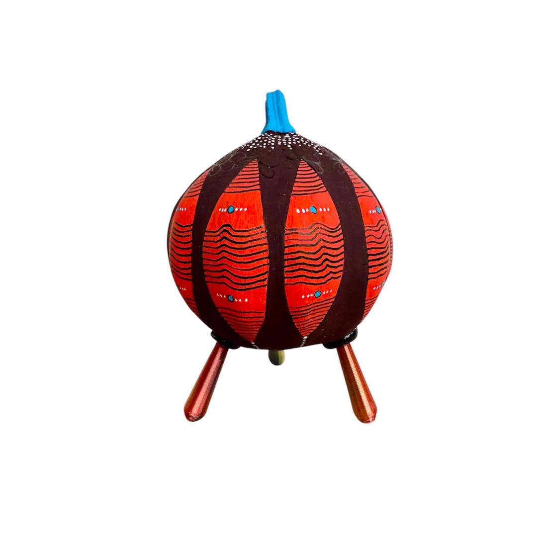 Coloquinte peinte (gourde lagénaria sèche). 3 pieds imprimés en bio-plastique (amidon de maïs). Hauteur totale 13 cm
