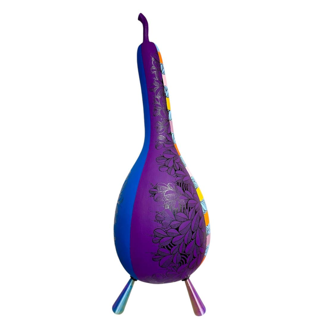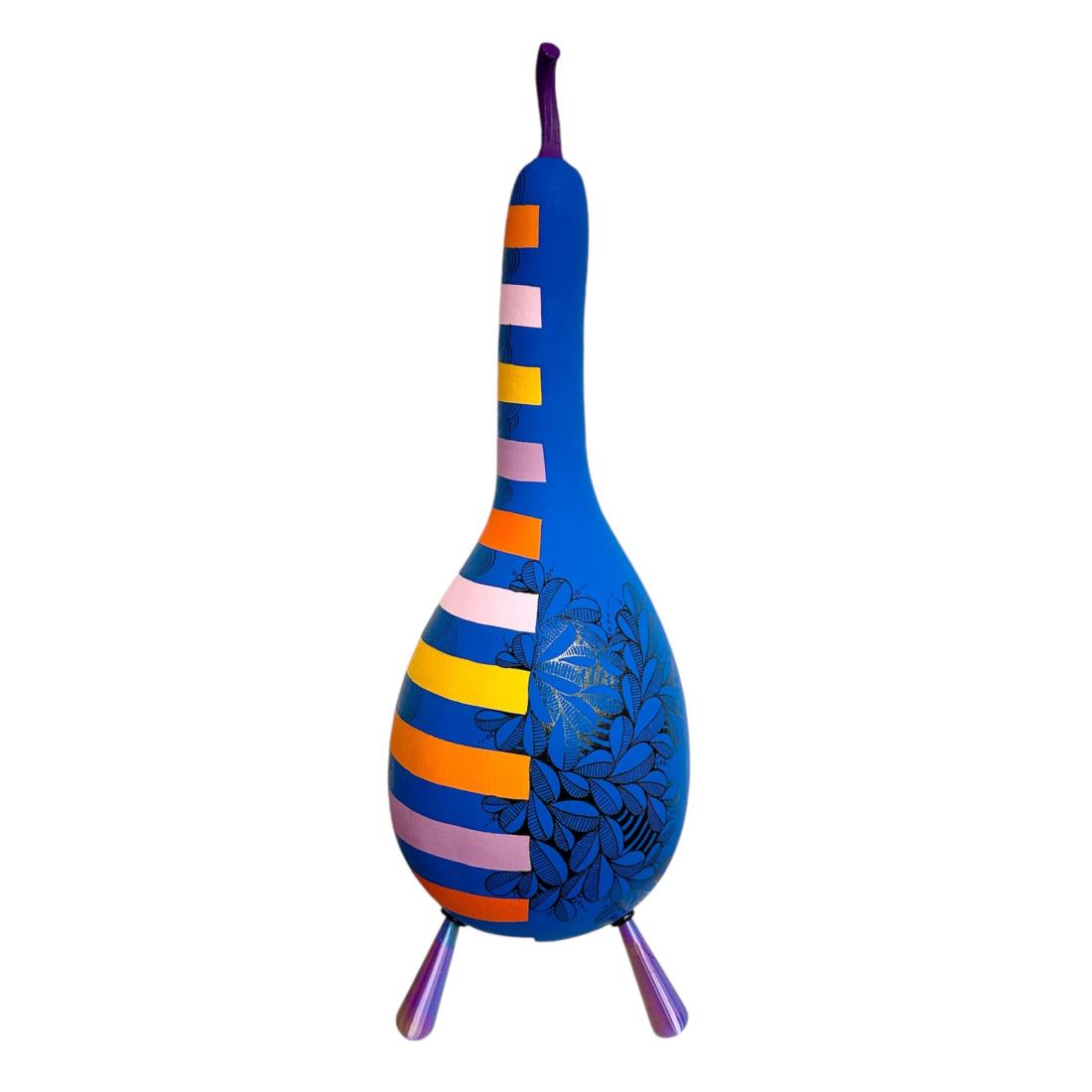 Coloquinte peinte (gourde lagénaria sèche). 3 pieds imprimés en bio-plastique (amidon de maïs). Hauteur totale 46 cm. Pièce unique.