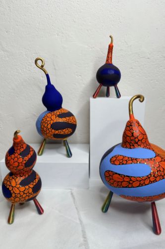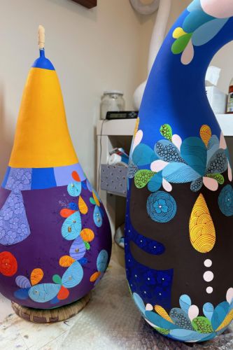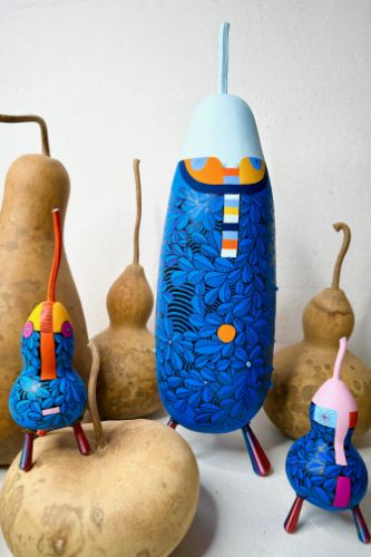 Je cultive des coloquintes (gourdes lagénaria ou calebasses) qui, une fois sèches, acquièrent la solidité du bois. La nature me fournit la forme ; j’en fais le support de mon art. Sur ces volumes naturels, je dessine des personnages, des animaux et des végétaux.