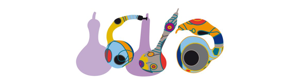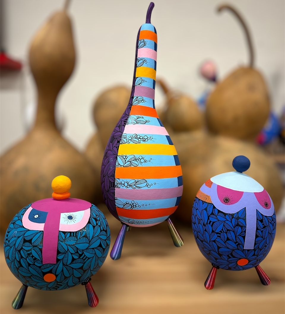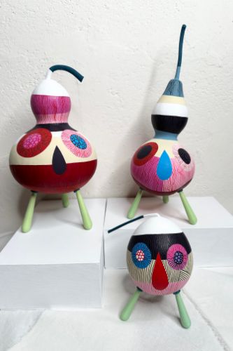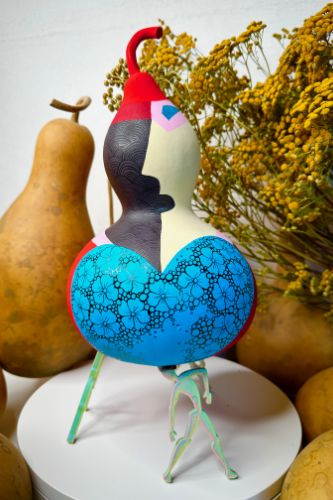 Je cultive des coloquintes (gourdes lagénaria ou calebasses) qui, une fois sèches, acquièrent la solidité du bois. La nature me fournit la forme ; j’en fais le support de mon art. Sur ces volumes naturels, je dessine des personnages, des animaux et des végétaux.