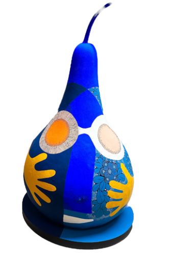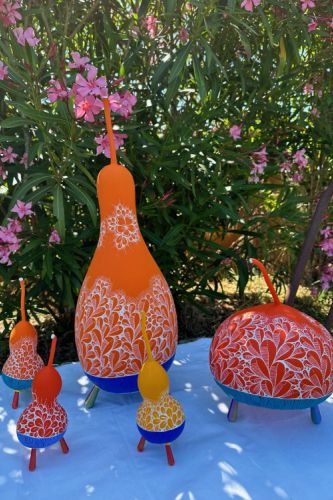 Je cultive des coloquintes (gourdes lagénaria ou calebasses) qui, une fois sèches, acquièrent la solidité du bois. La nature me fournit la forme ; j’en fais le support de mon art. Sur ces volumes naturels, je dessine des personnages, des animaux et des végétaux.