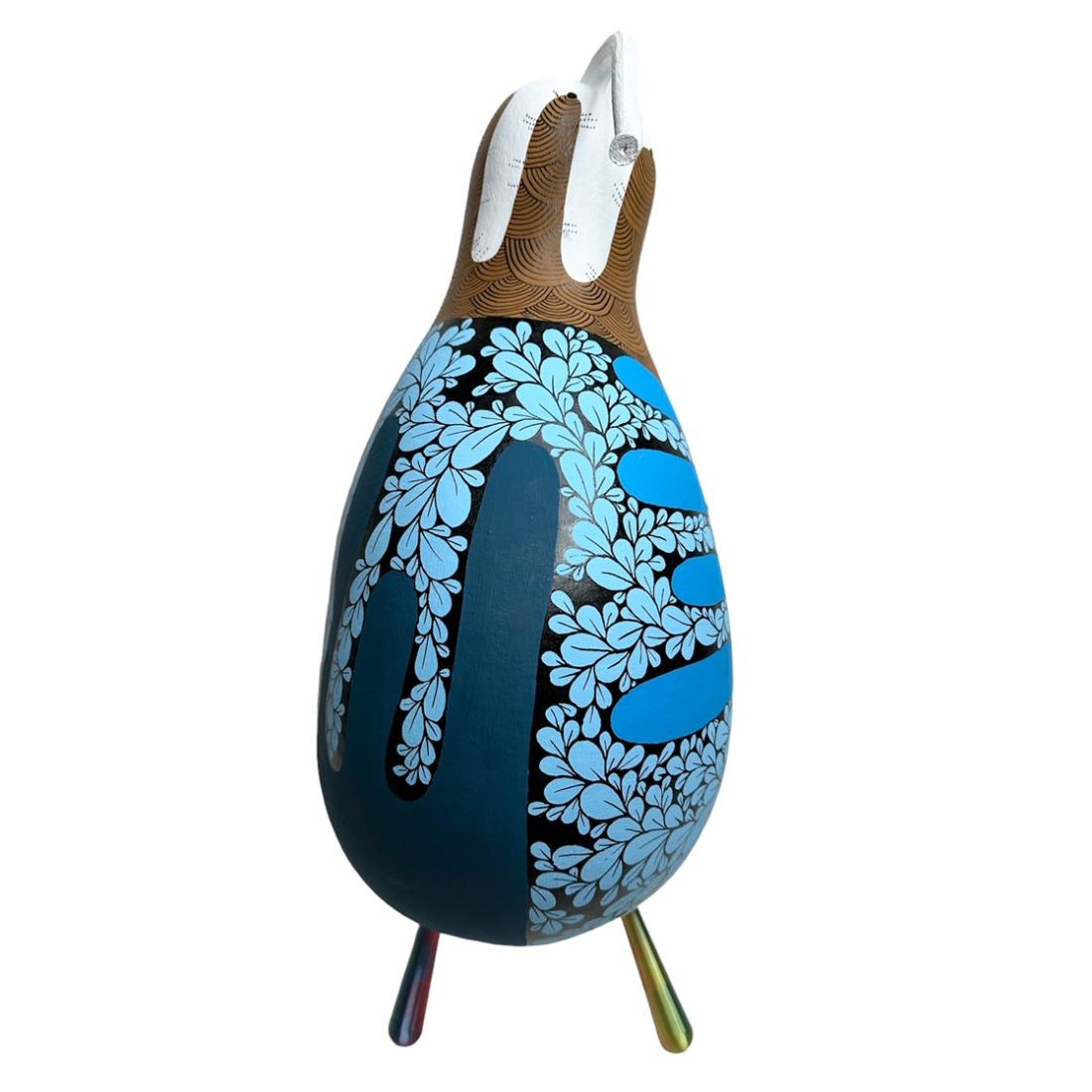Coloquinte peinte (gourde lagénaria sèche). 3 pieds imprimés en bio-plastique (amidon de maïs). Hauteur totale 32 cm. Pièce unique